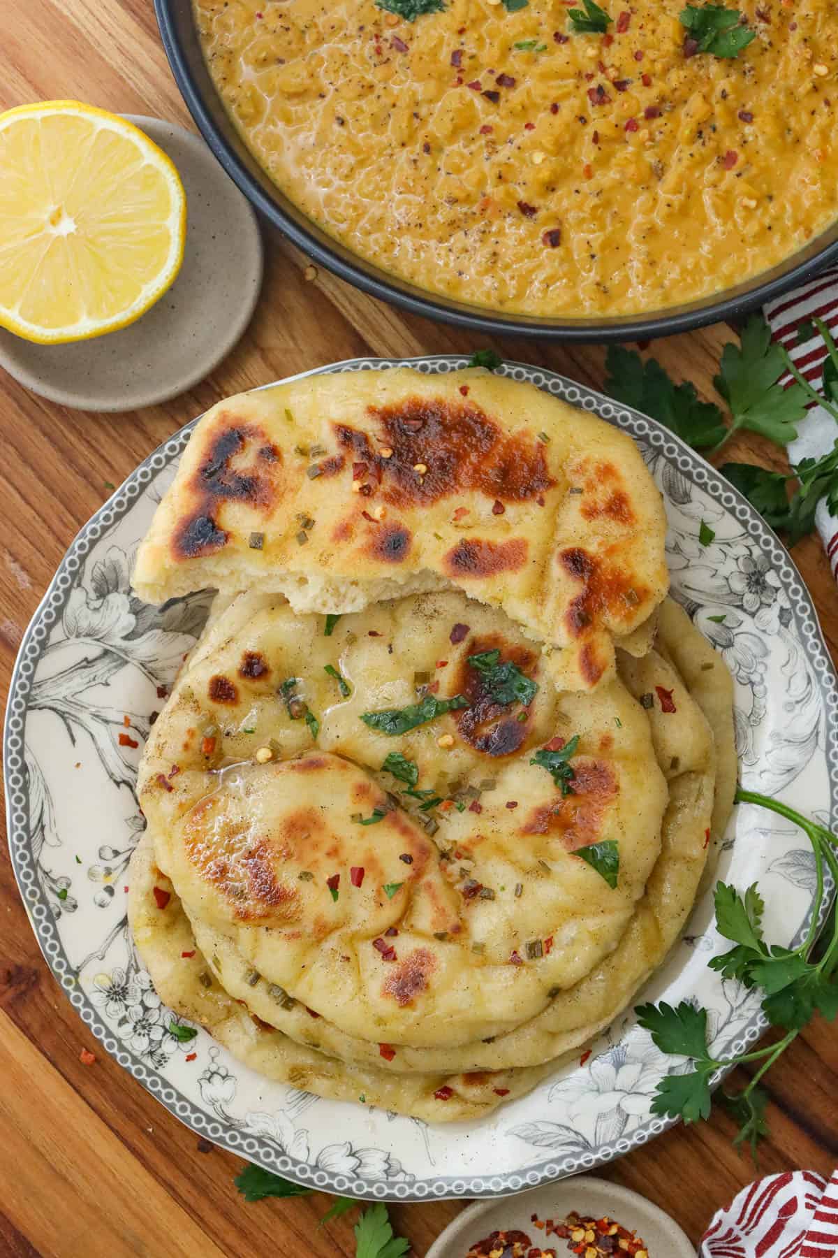 - Herb naan: Sprinkle chopped cilantro or parsley over buttered naan.