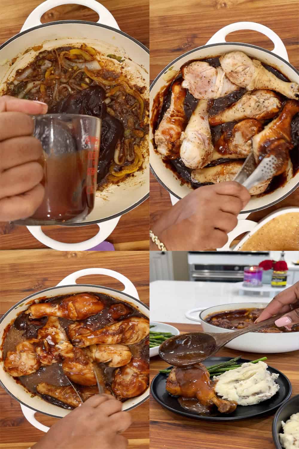 - Prep the chicken drumsticks: Preheat your oven to 425°F. Wash then pat the drumsticks dry with a clean kitchen towel. Then make a slit on the drumstick with a knife so that the seasoning can fully be embedded into the meat. Season the meat with 1 tablespoon of Jacmel seasoning blend and 1 tablespoon of salt and ½ tbsp. ground black pepper. Set aside and allow it to marinate for at least 30 minutes. When ready to cook, transfer the meat to the baking dish and add the marinated liquid on top of the meat. Cover the dish with aluminum foil, and bake for about 25 minutes at 425°F.Make The Sauce: In a large Dutch oven or braiser over medium heat, bring the oil to a heated temperature. Then add the sliced onions, green onions, and bell peppers. Sautee for about 45 seconds to 1 minute, stirring occasionally, then add the remaining Jacmel seasoning blend along with the Worcestershire sauce. Mix well to combine. Reduce the heat to low, then add the BBQ sauce. Allow to simmer for about 3 minutes, stirring constantly. Remove the sauce from the heat.