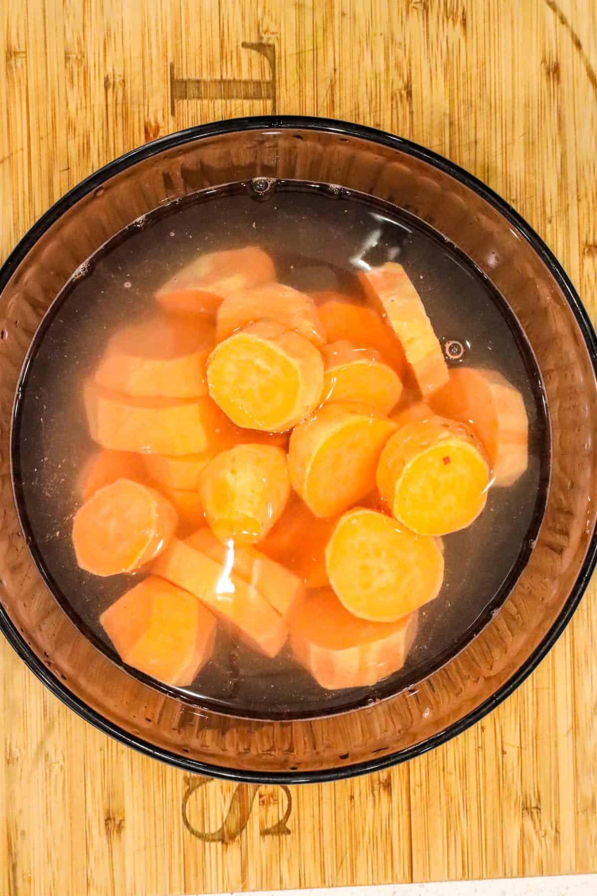 - Prep the sweet potatoes: Peel, rinse, and cut your sweet potatoes into chunks—roughly the same size so they cook evenly.Combine everything: Add the sweet potatoes in a large saucepan or deep skillet, add water, butter, brown sugar, vanilla extract, Bèlans, and salt. Stir everything to combine in the sugary mixture.